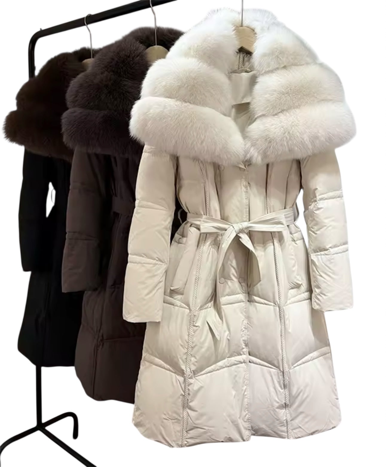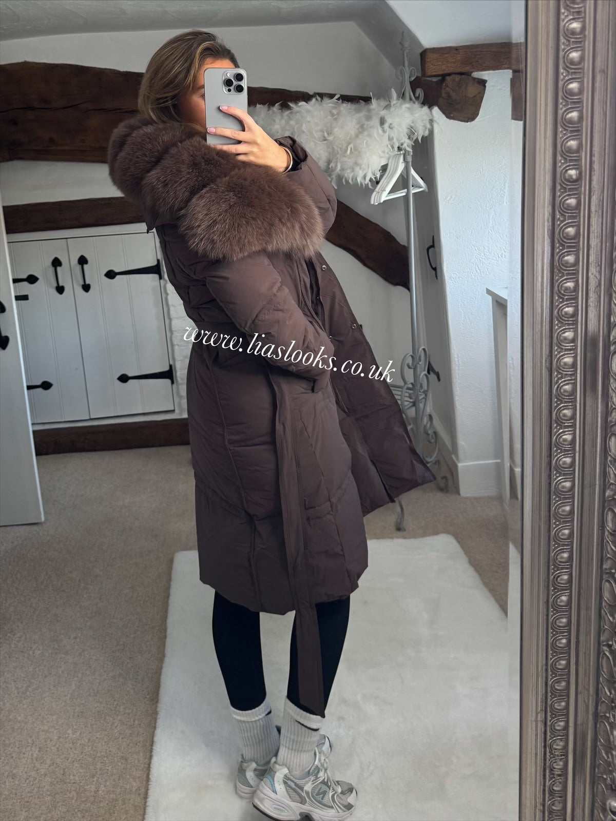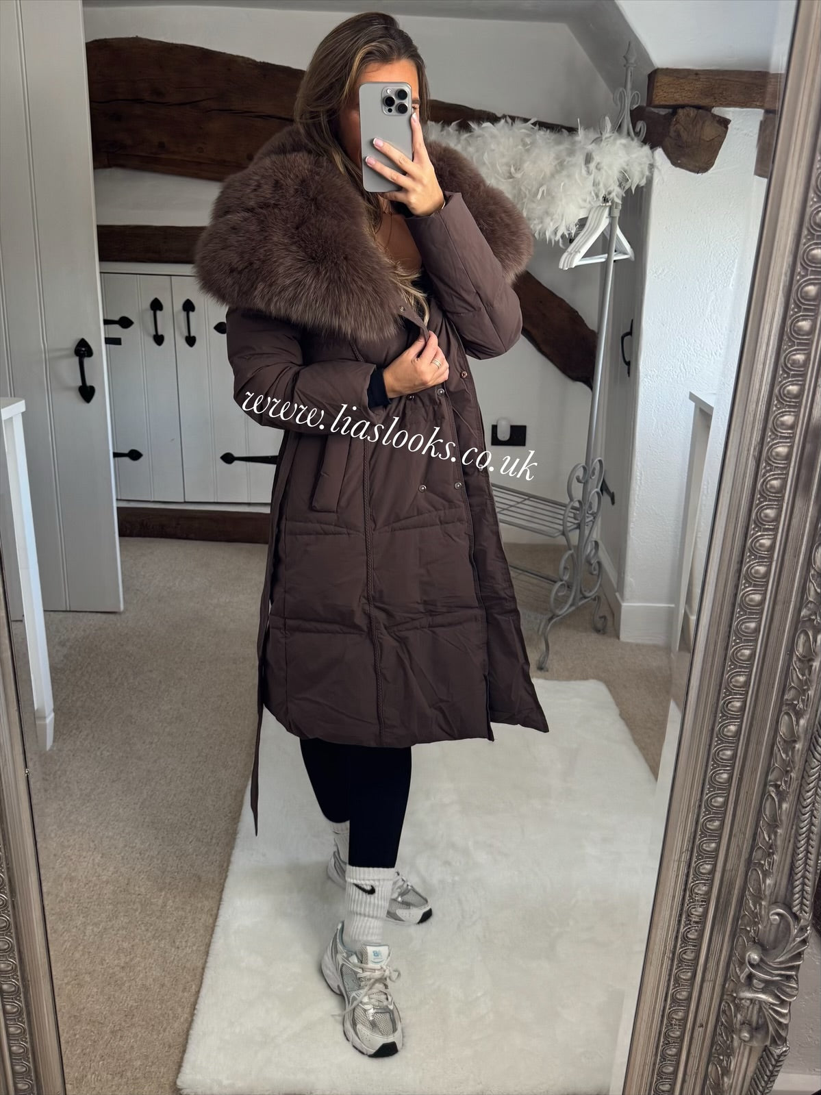 Premium quality fur trimmed parka coat, duck down filling, fox fur, long sleeve, long length, popper fastening, belt tie up, pockets, water proof, 2 pockets to the front
